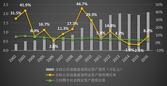 在歷經10年的投資高速增長后,市政公用設施建設大體完成,2012年之后投資開始進入穩定增長通道,近幾年的投資額基本穩定在2萬億左右,占同期全社會固定資產投資總額的比例持續下降。2016年全國市政公用設施建設固定資產投資總額為2.1萬億元,占同期全社會固定資產投資總額的3.4%。